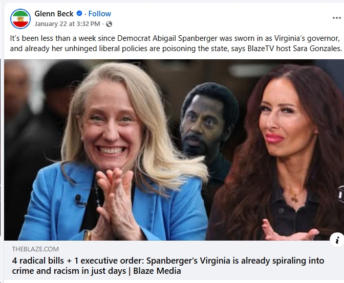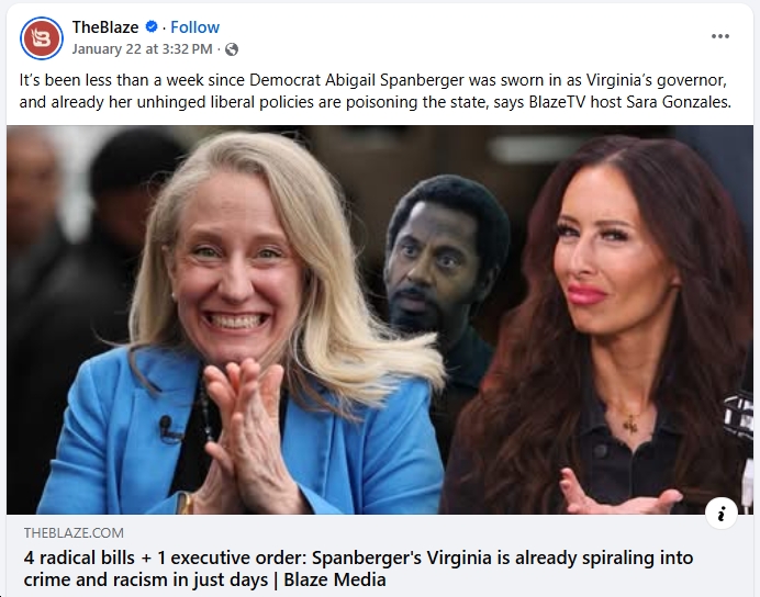- “The Blaze” claiming that Spanberger’s “unhinged liberal policies are poisoning the state.”