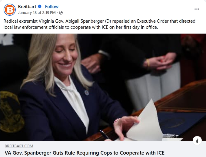 Barely two weeks into her governorship, with not a bill signed into law yet – and with solid/strong majorities of Virginians approving of Democratic priorities (and with Virginians optimistic about Gov. Spanberger’s term in office, by a whopping 60%-33% margin) – it’s fascinating to watch as Republicans/right wingers freak the f*** out about Abigail Spanberger. See below for just a few examples, including:
