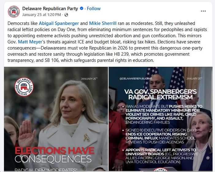 Also note a few key points: 1) Spanberger, despite her relentless self-“branding” as a “moderate,” “bipartisan,” etc., and the reality that she actually has a very normal Democratic voting record (if anything, she was one of the lowest-ranking Democrats in Progressive Punch, #198 in 2014), is STILL being labeled by the right wingers as a “radical”/”Marxist”/etc, even though that’s wildly false, showing that Republicans will use these absurd attacks no matter what a Democratic politician does; 2) Spanberger hasn’t signed a single bill into law at this point, having mostly just presided over a snowstorm and issued a few executive orders that were exactly what you’d expect any Democratic governor to issue; and 3) Republicans aren’t really doing this to Mikie Sherrill, which makes one wonder why they’re so obsessed with Spanberger – presumably they see her as a bigger theat for U.S. Senate, VP, president, etc. in 2028 or beyond? Anyway, it’s all very striking, and would be hilarious if it weren’t so deranged and potentially dangerous…
