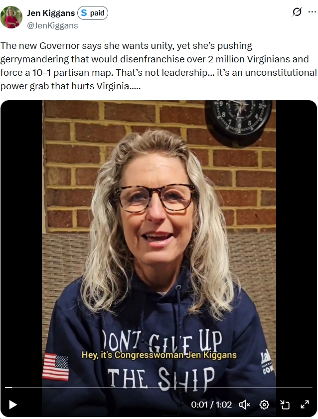 - Rep. Jen Kiggans (R-VA02) falsely claiming that Spanberger is the on pushing mid-decade redistricting in Virginia, and attacking her for supposedly doing so (but not attacking Trump for being the cause of all this, 100%).