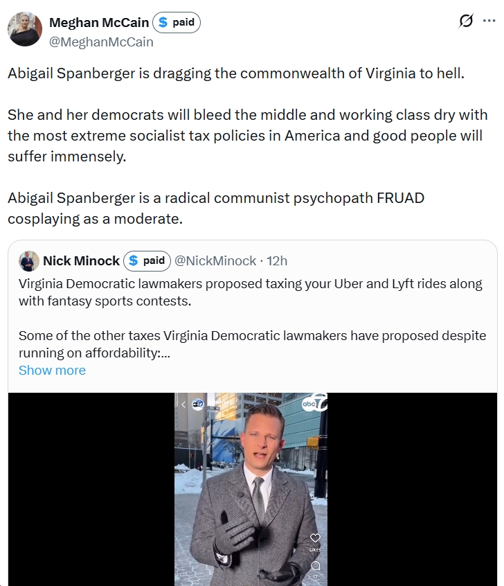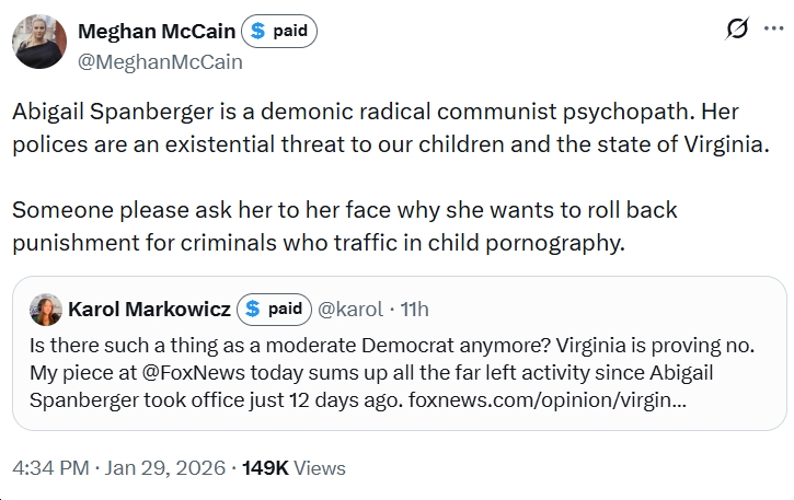 - Also from Meghan McCain: “Abigail Spanberger is a demonic radical communist psychopath. Her polices are an existential threat to our children and the state of Virginia,” etc.