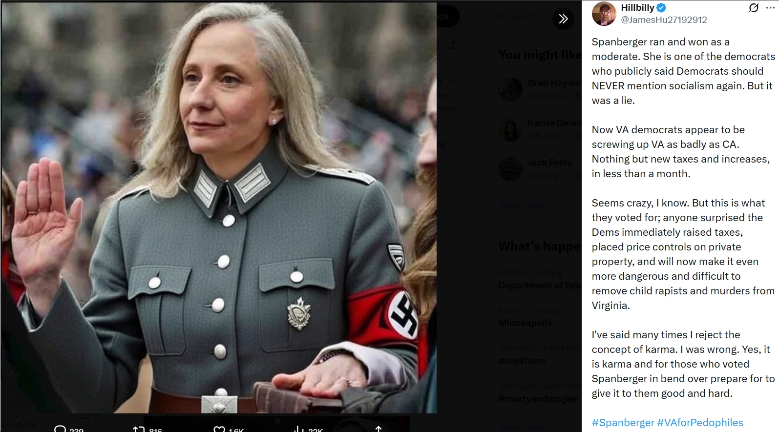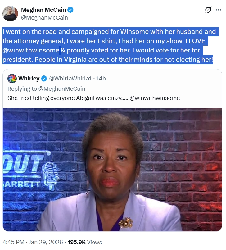 - Meghan McCain insanely claiming “Abigail Spanberger is dragging the commonwealth of Virginia to hell.”