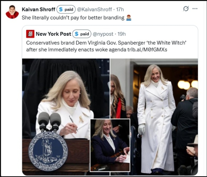 - The NY Post headline, “Conservatives brand Dem Virginia Gov. Spanberger ‘the White Witch” after she immediately enacts woke agenda”