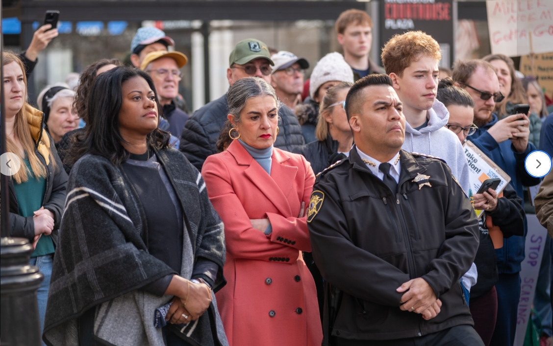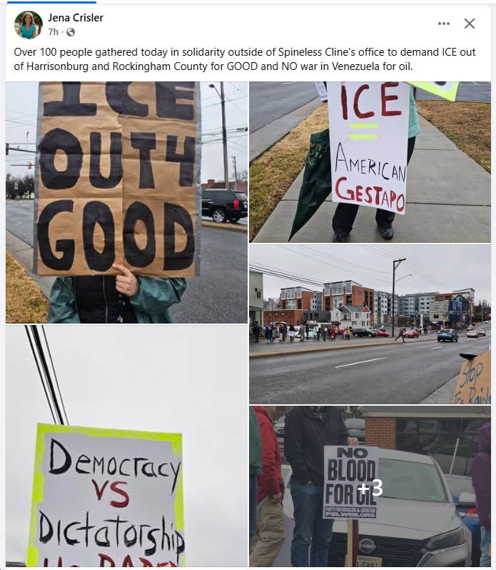 - “Over 100 people gathered today in solidarity outside of Spineless Cline’s office to demand ICE out of Harrisonburg and Rockingham County for GOOD and NO war in Venezuela for oil.” – Jenna Crisler