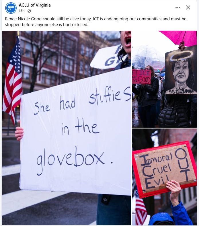 - “Renee Nicole Good should still be alive today. ICE is endangering our communities and must be stopped before anyone else is hurt or killed.” – ACLU VA