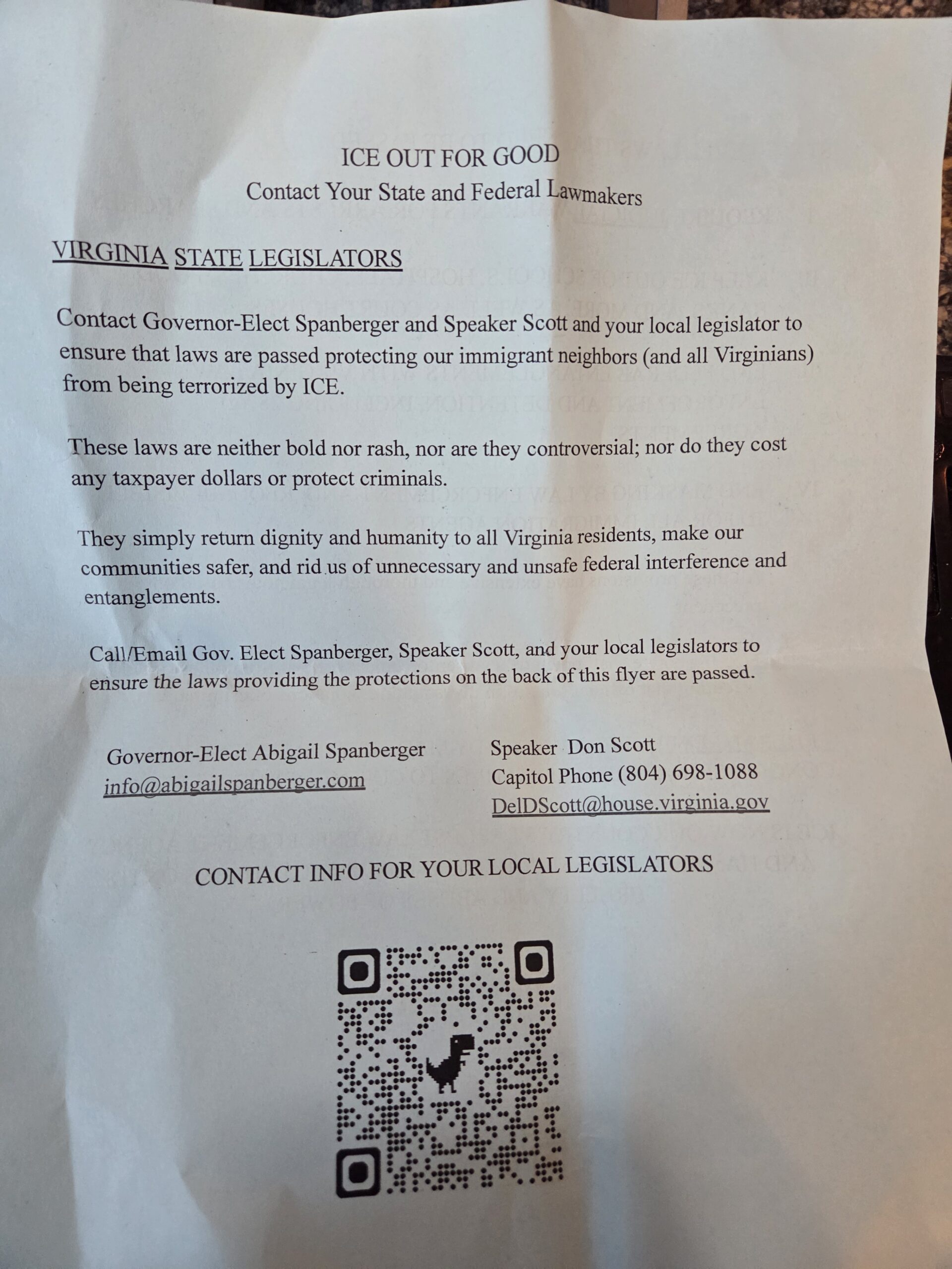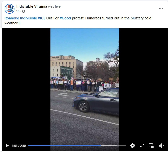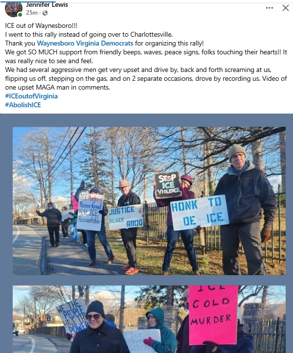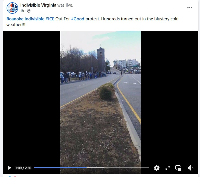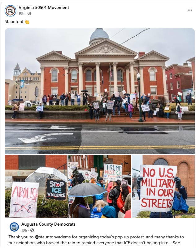 - “Thank you to @stauntonvadems for organizing today’s pop up protest, and many thanks to our neighbors who braved the rain to remind everyone that ICE doesn’t belong in our streets.”