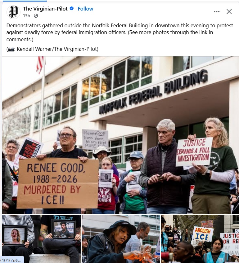 - “Demonstrators gathered outside the Norfolk Federal Building in downtown this evening to protest against deadly force by federal immigration officers. (See more photos through the link in comments.) (📸: Kendall Warner/The Virginian-Pilot)”