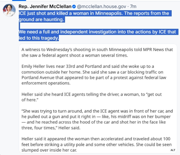 - First, Rep. Jennifer McClellan (D-VA04)’s statement makes it crystal clear that “ICE just shot and killed a woman in Minneapolis” and that the “reports from the ground are haunting.” And she’s correct that we “need a full and independent investigation into the action by ICE that led to this tragedy.” My only quibble is that I’d like to see our leaders call for the ICE agent’s arrest, immediately, as well as for serious accountability for the leaders of ICE, DHS, etc. (Although yes, I understand that Democrats hold no real levers of power in Washington, DC, so it’s more up to them to publicly speak out and to demand action by their Republican colleagues). Anyway, I’d give her statement a “B+/A-” (would have been an “A” if she had called for the agent’s arrest).