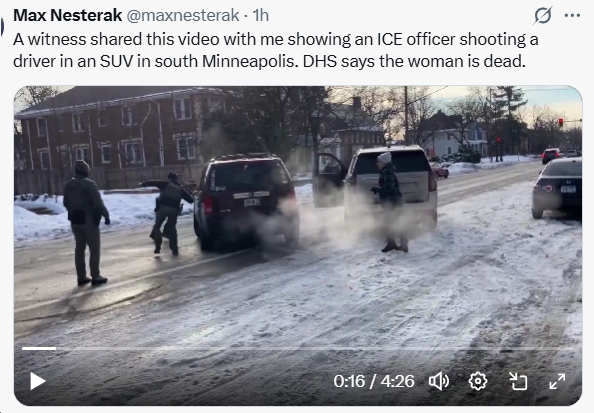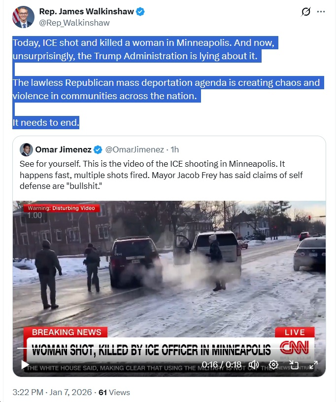 - Strong statement by Rep. James Walkinshaw (D-VA11): “Today, ICE shot and killed a woman in Minneapolis. And now, unsurprisingly, the Trump Administration is lying about it. The lawless Republican mass deportation agenda is creating chaos and violence in communities across the nation. It needs to end.” I’d give this a B+/A-; again, I’d love to see calls for the immediate arrest of the ICE agent who murdered a woman in cold blood.