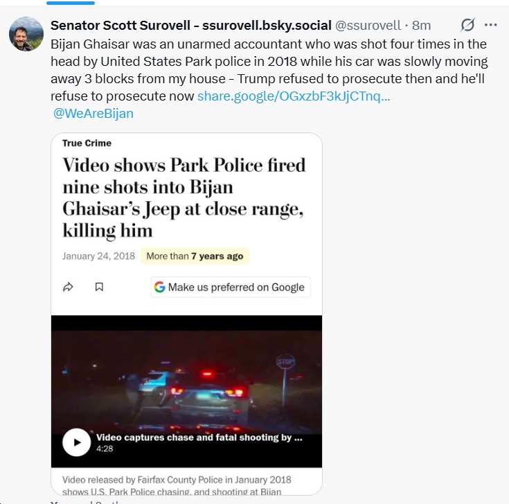- VA Senate Majority Leader Scott Surovell: “Bijan Ghaisar was an unarmed accountant who was shot four times in the head by United States Park police in 2018 while his car was slowly moving away 3 blocks from my house – Trump refused to prosecute then and he’ll refuse to prosecute now” (Question: Can the city or state prosecute?)