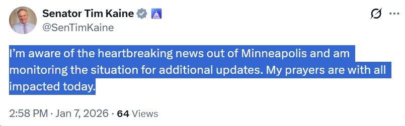 - Sen. Tim Kaine: “I’m aware of the heartbreaking news out of Minneapolis and am monitoring the situation for additional updates. My prayers are with all impacted today.” (This statement gets an incomplete for now…we’ll see if he weighs in further)