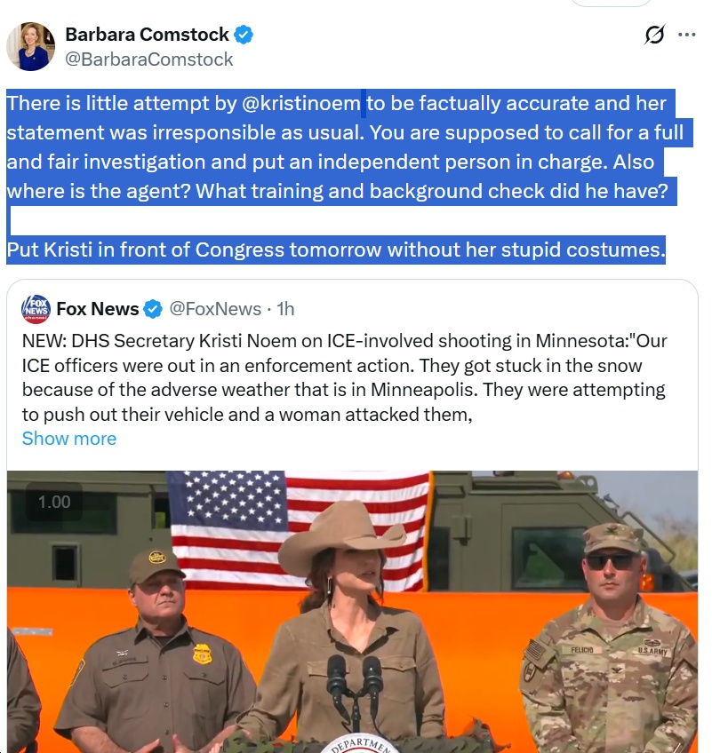- Former Rep. Barbara Comstock (R-VA10): “There is little attempt by @kristinoem to be factually accurate and her statement was irresponsible as usual. You are supposed to call for a full and fair investigation and put an independent person in charge. Also where is the agent? What training and background check did he have? Put Kristi in front of Congress tomorrow without her stupid costumes.” Comstock gets a high grade (B+?) for her response…just wish everyone would call for the arrest of the murderer.
