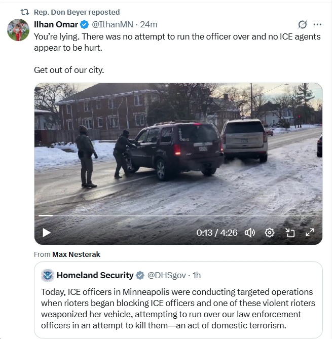 - Rep. Don Beyer (D-VA08) retweets Rep. Ilhan Omar (D-MN05)’s post about DHS flat-out lying (that the citizen “weaponized her vehicle, attempting to run over our law enforcement officers in an attempt to kill them,” as clearly (as Rep. Omar points out) “there was no attempt to run the officer over and no ICE agents appear to be hurt.” By the way, I’d give Rep. Omar’s tweet an “A” for sure.