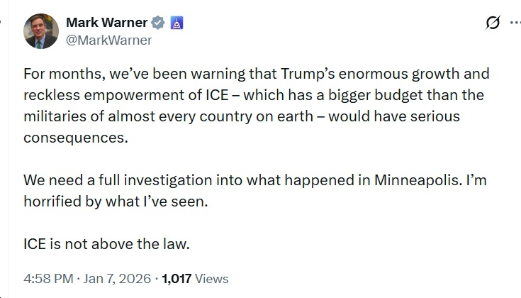 - Sen. Mark Warner: “For months, we’ve been warning that Trump’s enormous growth and reckless empowerment of ICE – which has a bigger budget than the militaries of almost every country on earth – would have serious consequences. We need a full investigation into what happened in Minneapolis. I’m horrified by what I’ve seen. ICE is not above the law.” (This statement gets a B minus…should note that “what happened in Minneapolis” was murder, and also call for the murderer to be arrested)