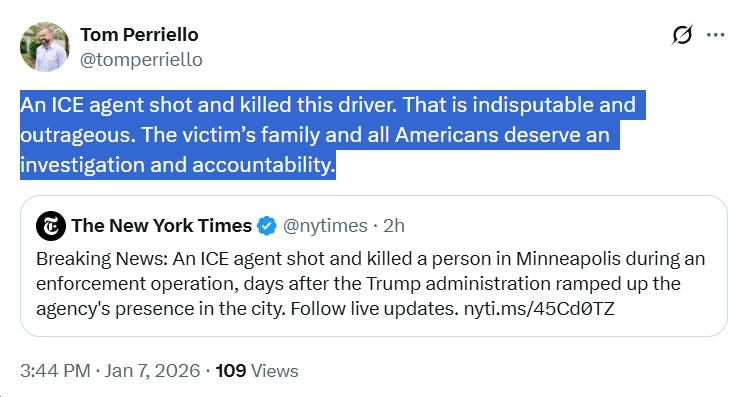 - Former Rep. Tom Perriello (D-VA05): “An ICE agent shot and killed this driver. That is indisputable and outrageous. The victim’s family and all Americans deserve an investigation and accountability.” (this statement gets an A-/B+)