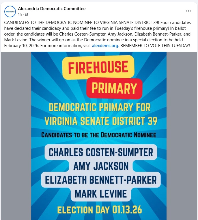 See below for video from last night’s SD39 Democratic forum, as well as information on today’s SD39 Democratic “firehouse primary” (see below for locations where you can vote), as well as the HD11 and HD23 special elections today (from 6 am to 7 pm at your regular polling locations). Busy times in Virginia politics for sure!