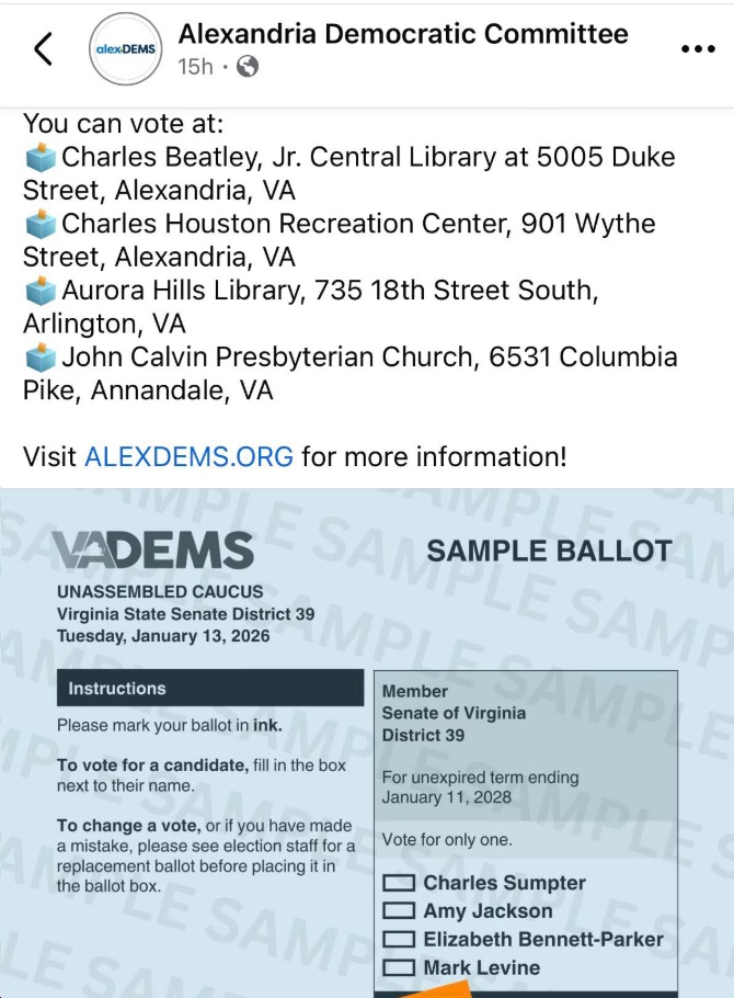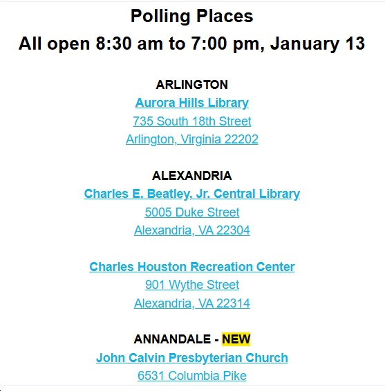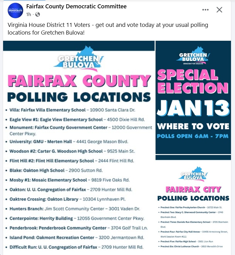- There will be two special elections for House of Delegates today (January 13): for the safe-blue HD11 seat previously held by Del. David Bulova, who is heading into the Spanberger administration as Secretary of Natural Resources; and for the also-safe-blue HD23 seat previously held by Del. Candi Mundon King, who is heading into the Spanberger administration as Secretary of the Commonwealth. HD11 Democratic nominee Gretchen Bulova (who won the nomination on 12/16/25) is facing Republican Adam Wise, while HD23 Democratic nominee Margaret Angela Franklin (who also won the nomination on 12/16/25) is facing Republican Vern Robinson.