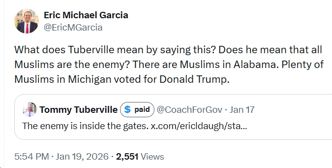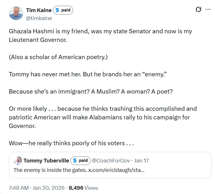 Three days ago, in response to Ghazala Hashmi being sworn in (on a Quran) as Virginia’s Lt. Governor – the first Muslim woman to be elected statewide in U.S. history – U.S. Senator Tommy Tuberville (R-Alabama) posted an unhinged, virulently Islamophobic comment (see screenshot, below) on Twitter (“The enemy is inside the gates”). So obviously, it should go without saying that this type of blatant anti-Muslim bigotry is disgusting, unacceptable and unAmerican. As Sen. Tim Kaine writes, in response: