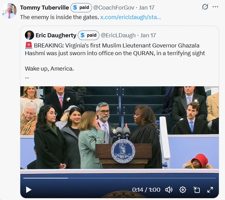 P.S. Of course, during the 2025 LG campaign, Hashmi’s far-right-Republican opponent, John Reid, repeatedly demonized her based on her religion, and basically there was “crickets” from Virginia Republicans…