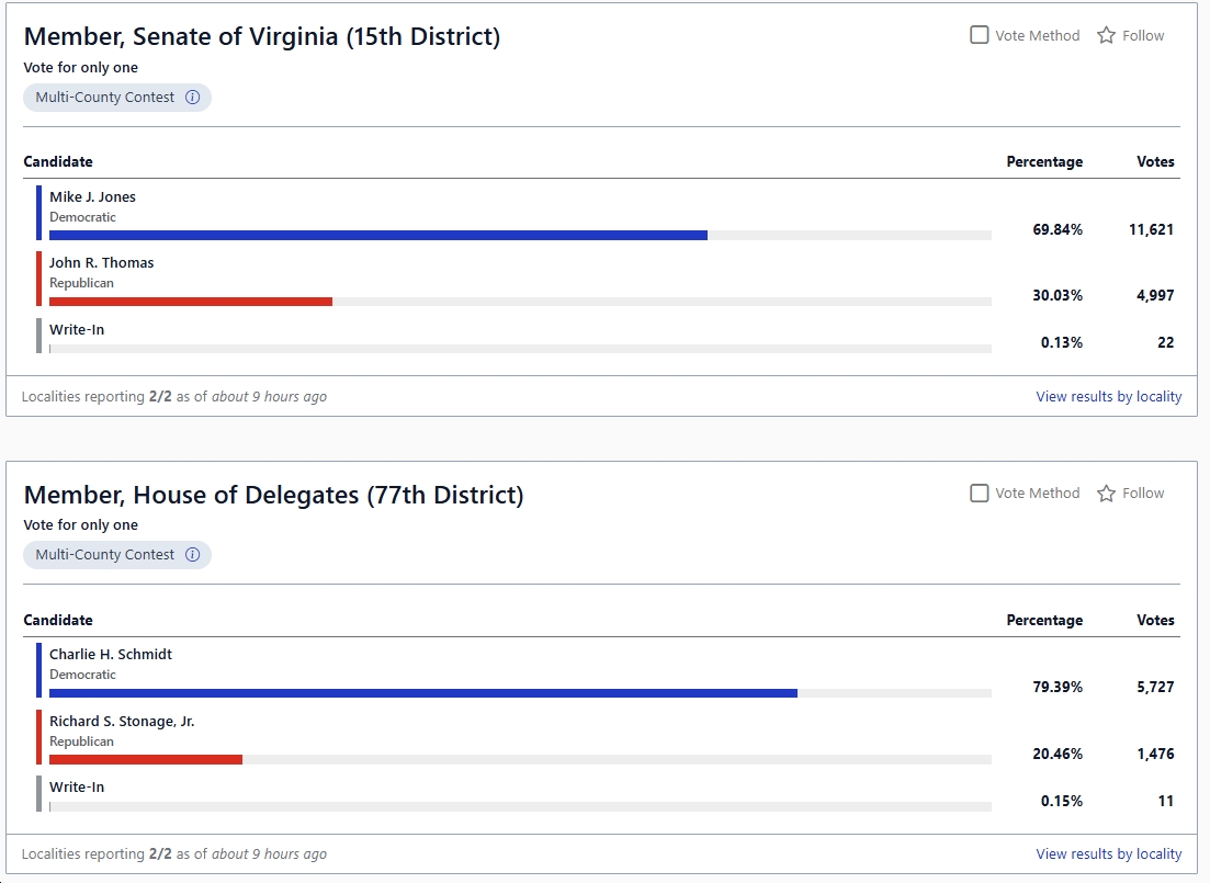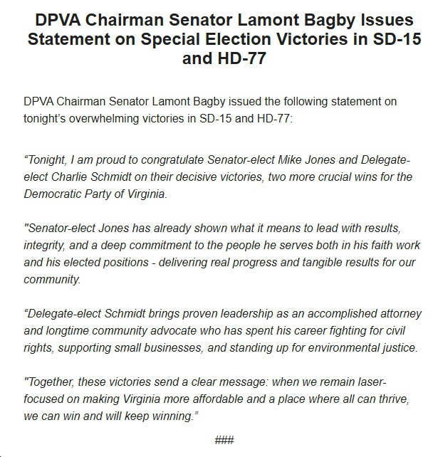 - First, safe-blue Virginia State Senate District 15 (Chesterfield County/Richmond City) has a vacancy due to the election in November of Ghazala Hashmi to the Lt. Governor position. The Democratic nominee, former Del. Mike Jones, won that nomination on December 7 by a 71%-29% margin, and is facing Republican John R. Thomas in the special election on January 6.