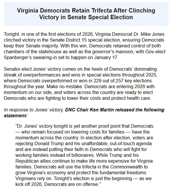 - There will be two special elections for House of Delegates on January 13: for the safe-blue HD11 seat previously held by Del. David Bulova, who is heading into the Spanberger administration as Secretary of Natural Resources; and for the also-safe-blue HD23 seat previously held by Del. Candi Mundon King, who is heading into the Spanberger administration as Secretary of the Commonwealth. HD11 Democratic nominee Gretchen Bulova (who won the nomination on 12/16/25) is facing Republican Adam Wise, while HD23 Democratic nominee Margaret Angela Franklin (who also won the nomination on 12/16/25) is facing Republican Vern Robinson.