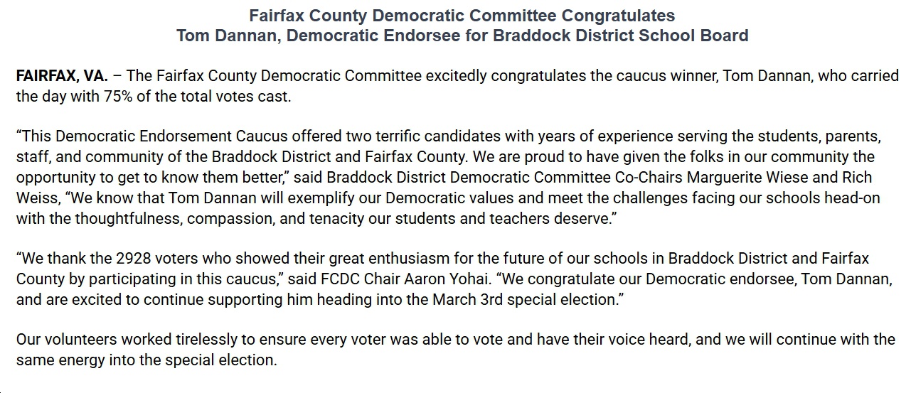 UPDATE 1/10 6:23 pm – Here are the final results…and a statement by the Fairfax Dems congratulating the winner, Tom Dannan.