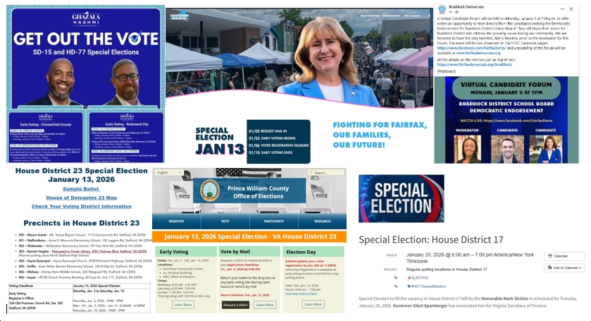 - There will be two special elections for House of Delegates on January 13: for the safe-blue HD11 seat previously held by Del. David Bulova, who is heading into the Spanberger administration as Secretary of Natural Resources; and for the also-safe-blue HD23 seat previously held by Del. Candi Mundon King, who is heading into the Spanberger administration as Secretary of the Commonwealth. HD11 Democratic nominee Gretchen Bulova (who won the nomination on 12/16/25) is facing Republican Adam Wise, while HD23 Democratic nominee Margaret Angela Franklin (who also won the nomination on 12/16/25) is facing Republican Vern Robinson.