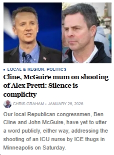 Sensing a pattern here? Bottom line: Virginia Republicans have nothing to say about the Trump administration’s thuggishness, lawlessness, authoritarianism, violence, etc., because in the end they know that 1) Trump/MAGA is who they are, who they endorsed, who they voted for, etc; 2) they know where their hard-core “base” is at; 3) politically speaking, they presumably know that the American people (other than the Republican “base”) DISAPPROVE of ICE’s tactics. Plus, presumably, they don’t have great talking points on the murder of Alex Pretti, other than joining in the Trump administration’s disgraceful, callous, appalling smear campaign against an ICU nurse who was holding a cell phone and trying to help a woman who had been pushed by a federal agent. So clearly, Virginia Republicans have calculated that for the time being at least, their best – albeit cowardly – bet is to simply ignore the biggest story (by far) in America right now. Yet again, nothing if not pathetic.