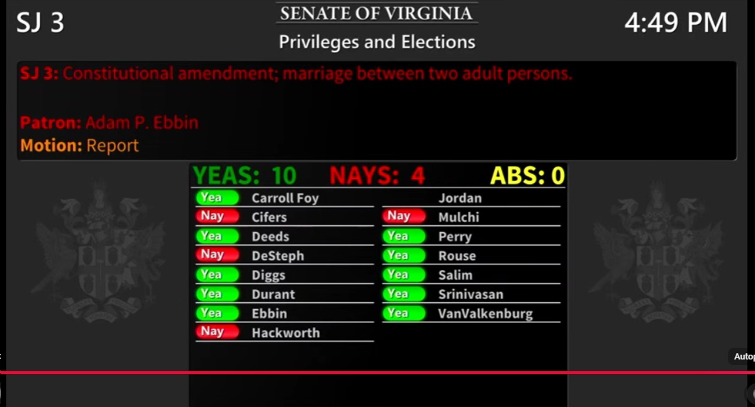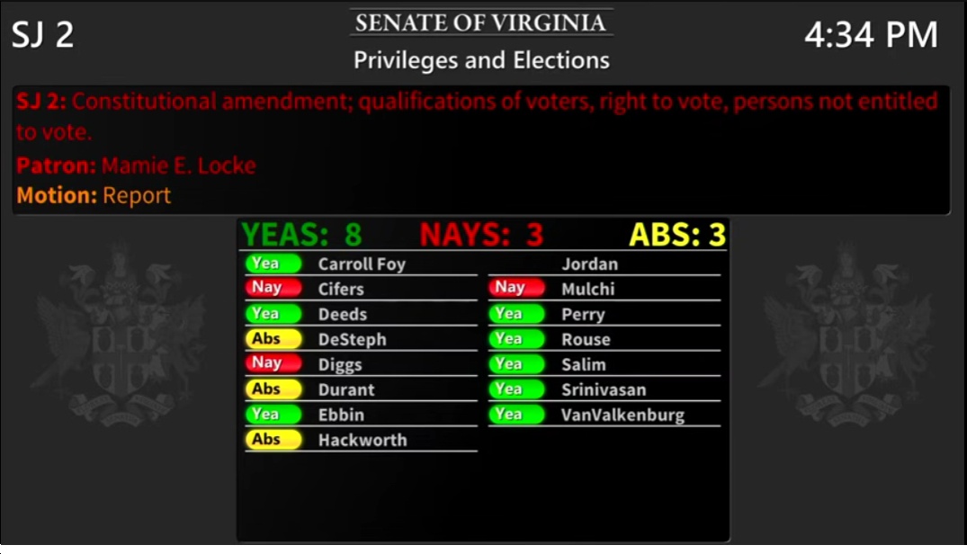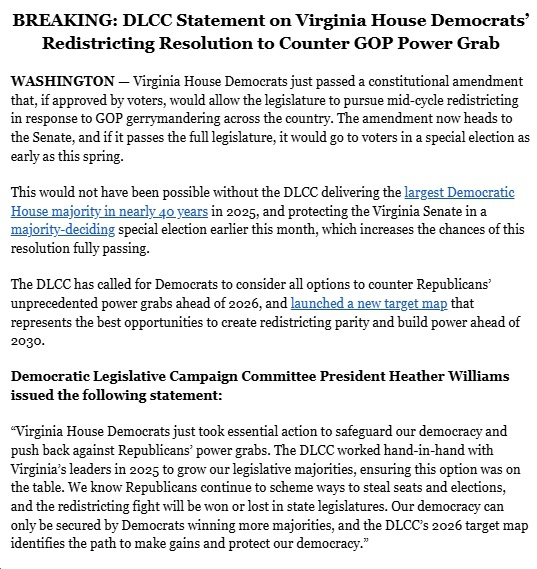 Good news from the VA House of Delegates and State Senate, as crucial constitutional amendments move ahead. See below for video and statements from the VA House Democrats and from the DLCC.