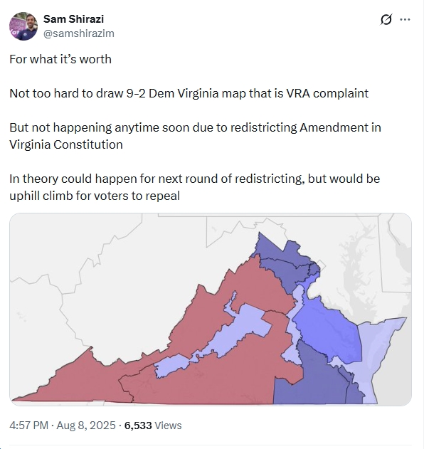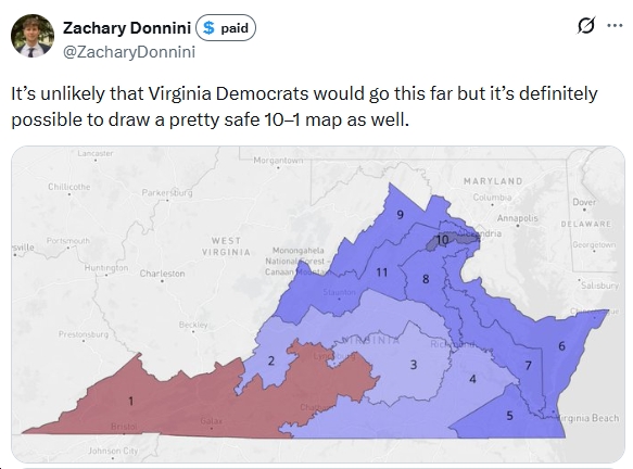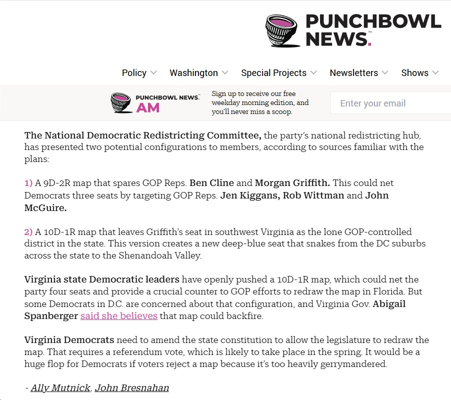 P.S. See Punchbowl for more (“Democrats are deliberating over just how aggressively to rewrite the congressional map in Virginia ahead of the November midterms”):