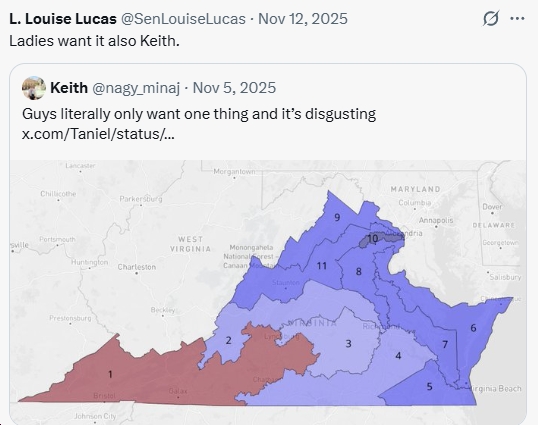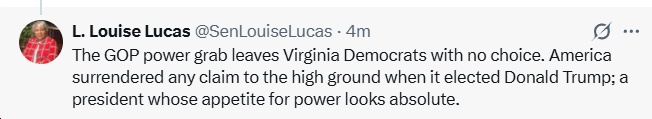 “If democracy is in danger from Trump’s attempts to mid-decade redraw in Texas, Miss and NC, then we must act accordingly. In January, I’m not voting to send redistricting to voters just to reinforce the status quo. We can get 8-3 w/ the current maps. 10-1. Right, Sen. Louise Lucas?”