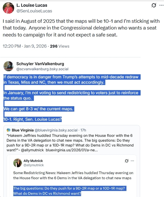 So is there any major advantage to NOT just “going for it” and drawing a 10D-1R map, given that we’re going through all this effort to pass a new constitutional amendment? As you can see, below, it looks like VA Senate President Pro Tempore Louise Lucas is VERY much “going for it,” as she says she’s “sticking with [a 10-1 map] today,” adding that “anyone in the Congressional delegation who wants a seat needs to campaign for it and not expect a safe seat.” Innnnnteresting. Also see below for a comment by State Senator Schuyler VanValkenburg, who has been one of the biggest champions in the legislature for the bipartisan redistricting amendment and against gerrymandering. According to Sen. VanValkenburg, though, at this point here’s where we’re at.