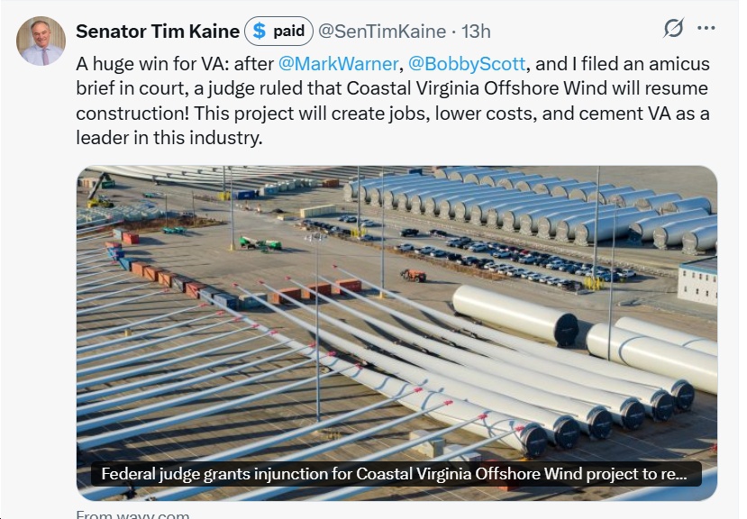- Sen. Mark Warner: “Good news for an (almost completed!) project that never should have been paused in the first place. Trump’s reckless, illegal, and politically-motivated attack on offshore wind only serves to drive up Virginians’ power bills further and risk good-paying jobs. We’ll keep fighting for these critical energy projects.”