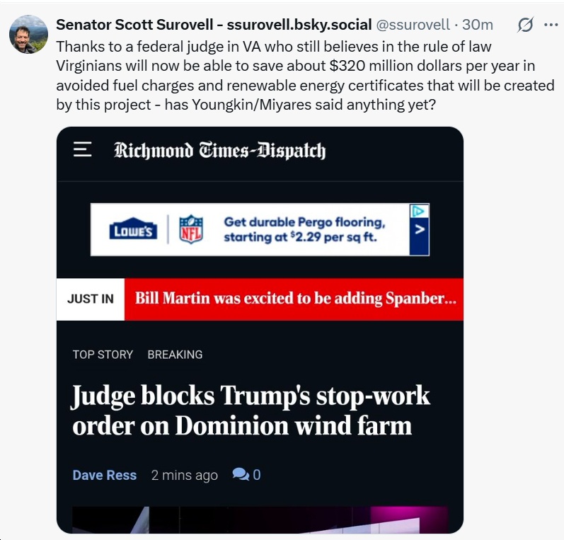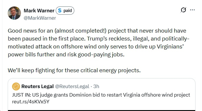 - Sen. Mark Warner: “Good news for an (almost completed!) project that never should have been paused in the first place. Trump’s reckless, illegal, and politically-motivated attack on offshore wind only serves to drive up Virginians’ power bills further and risk good-paying jobs. We’ll keep fighting for these critical energy projects.”