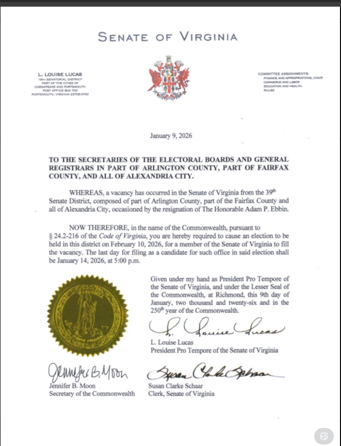 Congratulations to State Senator Adam Ebbin (D-SD39; Alexandria/Arlington/Fairfax) on his appointment to Gov.-elect Abigail Spanberger’s administration, “as Senior Advisor at the Virginia Cannabis Control Authority beginning in mid-February.” Note that this will be after “crossover” – the mid point of the General Assembly session – and also, crucially, after votes are taken on the redistricting amendment and other key legislation. Per Wikipedia:
