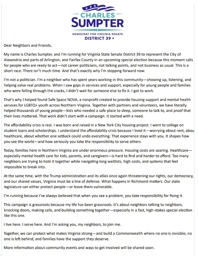 Our country is in crisis, with a corrupt Presidential Administration determined to take away our freedoms, weaken our democracy, and unloose ICE to terrorize our communities. The people of Alexandria, Arlington, and Fairfax face an affordability crisis, with a tough job market, students struggling with student loans, high home prices, and runaway inflation caused by the Trump tariffs.