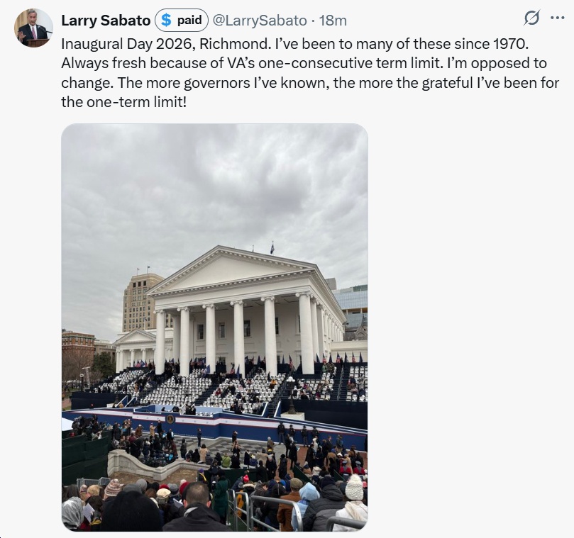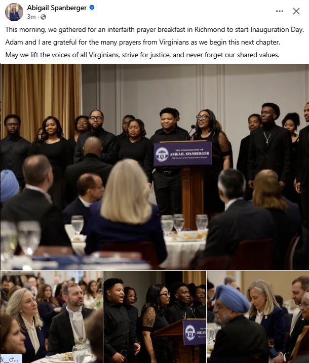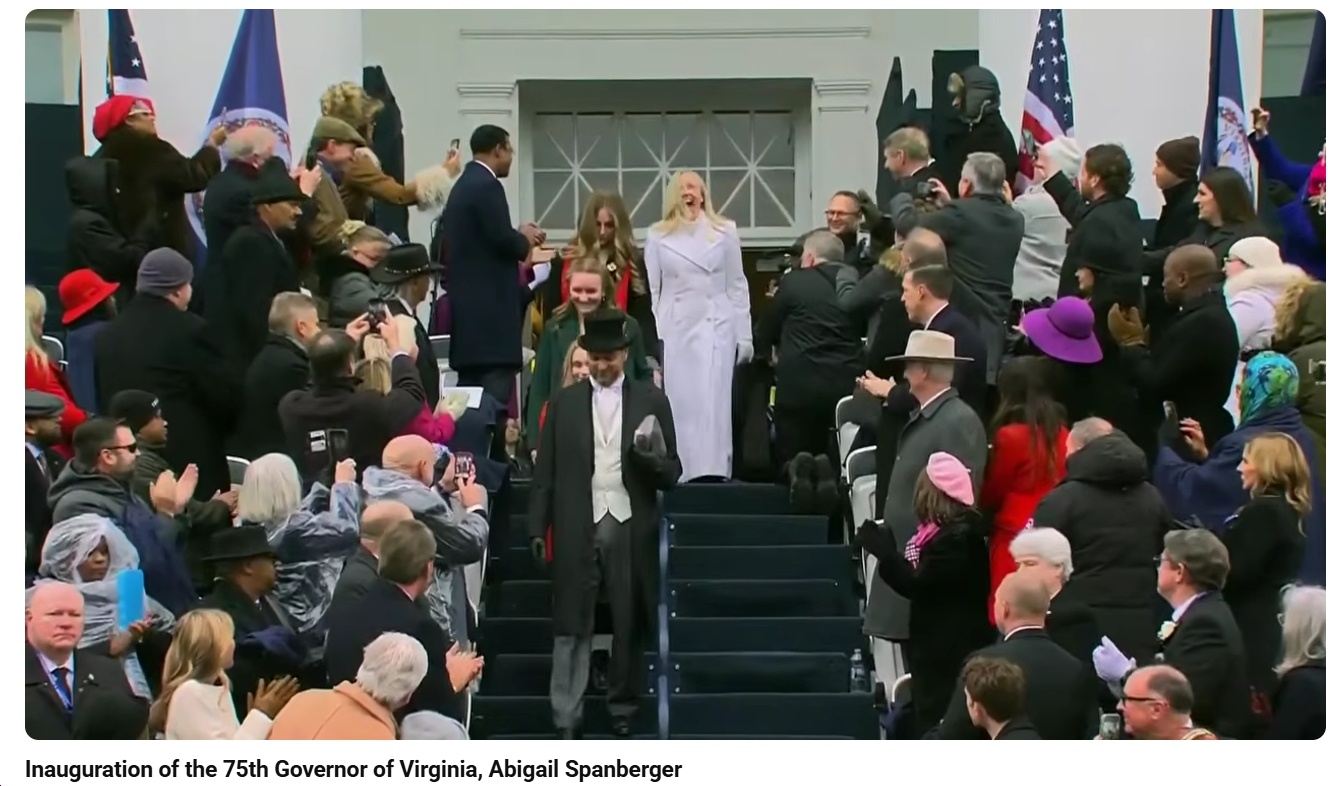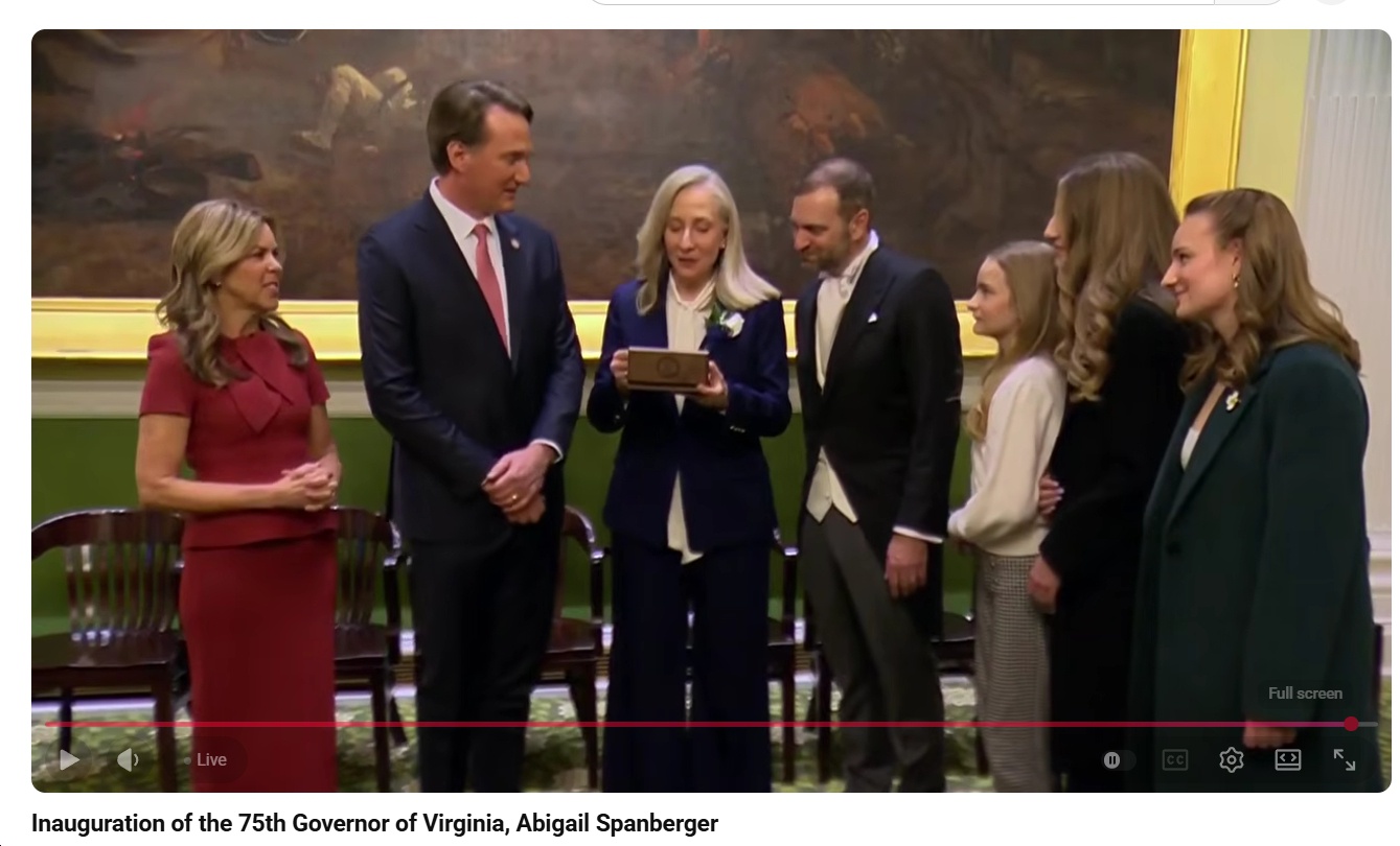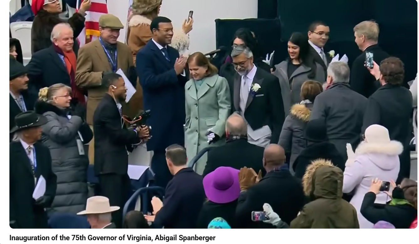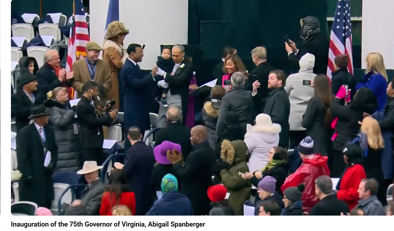See below for video and highlights from the inauguration of Abigail Spanberger as the 75th governor (and the first woman governor!) of Virginia , along with Ghazala Hashmi as Lt. Governor (the first Muslim woman elected to statewide office in America), and Jay Jones as Attorney General (and first African-American Virginia Attorney General). So lots of “firsts,” and also just a major upgrade from what we had the past four years. Also, of course, Democrats will also have a governing “trifecta” (governorship, State Senate and House of Delegates majorities) for the first time since 2020-2021. So hopefully, Democrats will get a lot done to move Virginia forward.
