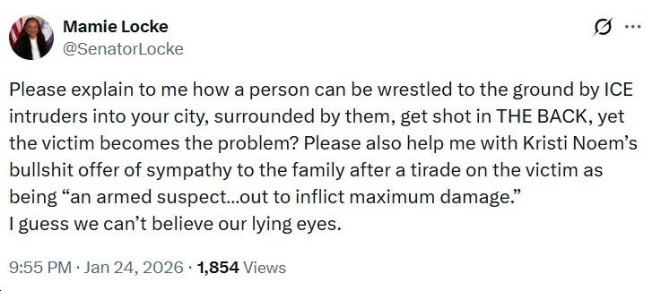- Rep. Jennifer McClellan (D-VA04): “Today brings another horrific death in Minneapolis, this time at the hands of Border Patrol agents. Alex Pretti’s death must be thoroughly and independently investigated, and those responsible must be held accountable. The Trump Administration must end the public safety crisis that its overly aggressive DHS, ICE and Border Patrol agents have created.”