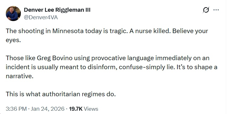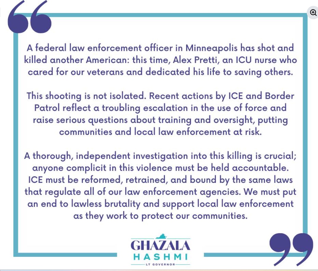 Gov. Abigail Spanberger: “Today another person is dead in Minnesota. Videos are again showing chaotic law enforcement actions that end with Border Patrol agents shooting and killing an intensive care unit nurse. The chaotic scene today — and on the day Renee Good was killed — raise countless questions. Questions about: – Border Patrol and ICE vetting, training, and accountability – The purpose and intent of their engagement across communities – The long-term damage their reckless actions are doing to the trust other law enforcement agencies and police departments have built over years as they have worked to investigate crimes and keep communities safe. There must be a full investigation into what happened, and there must be accountability.”