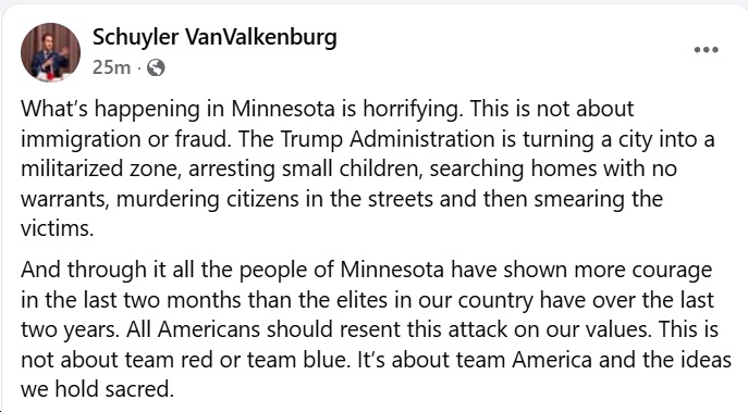 - Sen. Tim Kaine: “The Minneapolis shooting is sickening. People around the world think this is America now. Is it? The Senate must show backbone in stopping Trump from terrorizing our communities.”