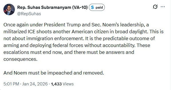 - Former Rep. Tom Perriello (D-VA05): “Senators, obey your oath. Vote against ICE’s blank check to kill with impunity. This includes every GOP Senator who’s bragged about carrying the Constitution in their pocket or posed with a Gadsden flag and now actually has a vote to check federal tyranny. Remember this?”