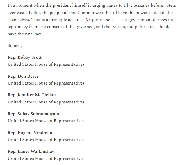 In a moment when the president himself is urging states to tilt the scales before voters ever cast a ballot, the people of this Commonwealth still have the power to decide for themselves. That is a principle as old as Virginia itself — that government derives its legitimacy from the consent of the governed, and that voters, not politicians, should have the final say.