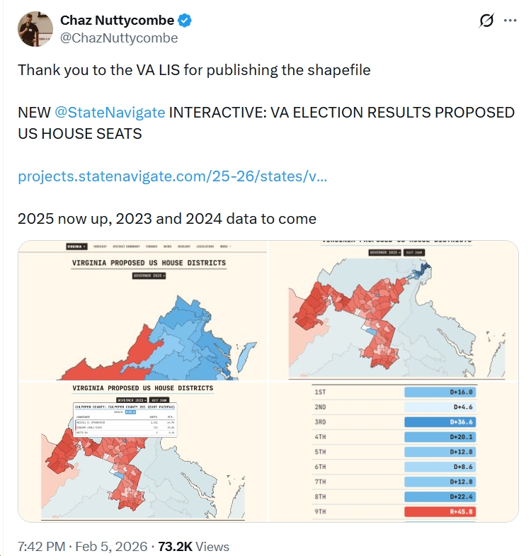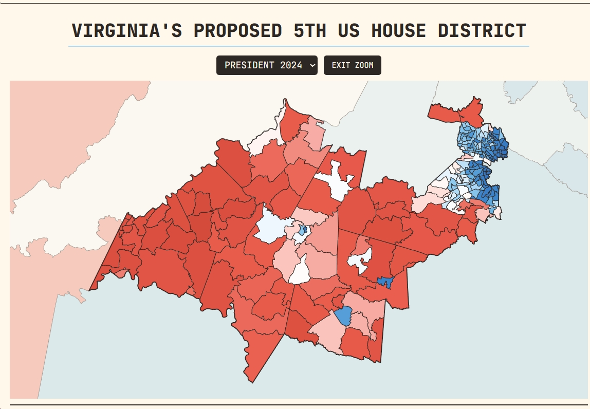 See below for a statement from Henrico County Commonwealth’s Attorney Shannon Taylor, who has been running for the Democratic nomination in VA01, but now is announcing a change of plans given the redistricting amendment/new map. For more information on the newly drawn VA05 (D+8.7 points), see State Navigate (and also a screenshot, below; compare to the current VA05 here). We’ll see how the new district maps scramble the field for VA01, VA05, etc.