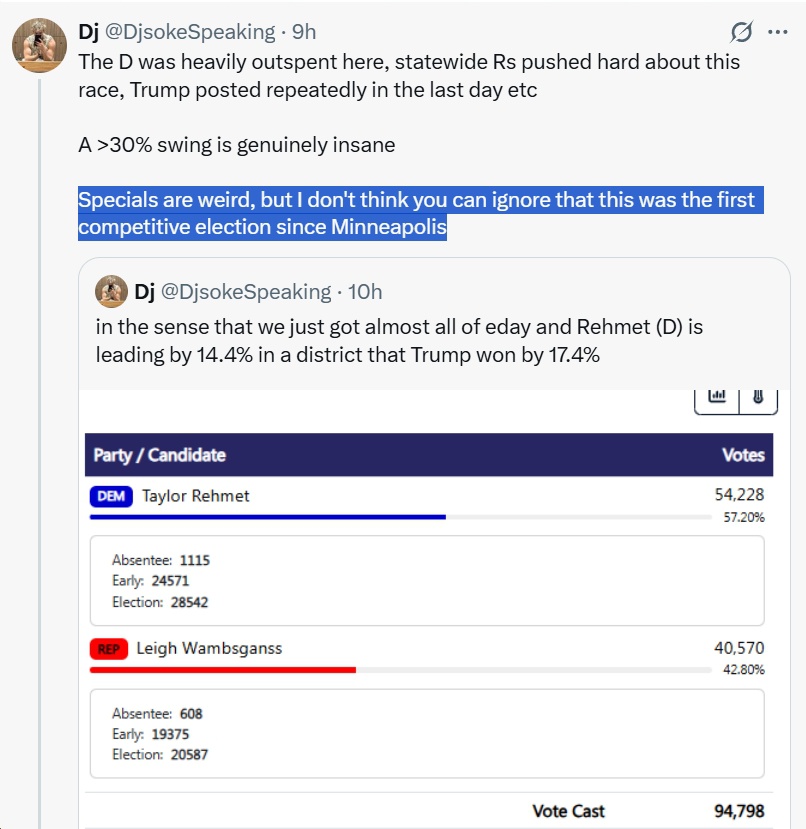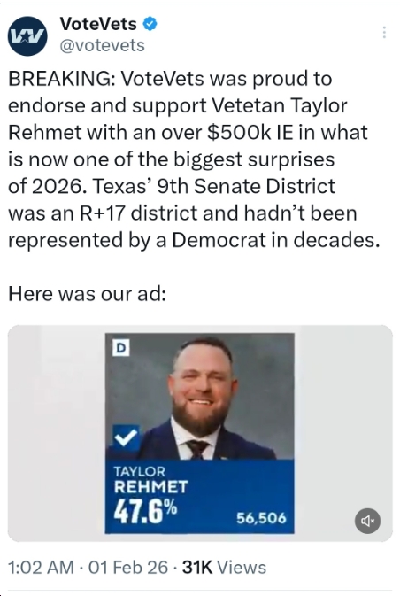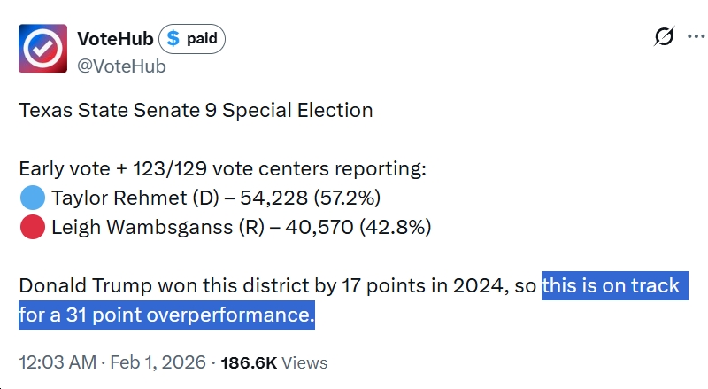 Last night in the Texas State Senate 9 (Tarrant County, including a large part of Forth Worth) special election, Democrats saw roughly a 31-point “overperformance,” with Democratic candidate Taylor Rehmet winning by 14+ points in a district won by Trump in 2024 by a whopping 17 points. This isn’t an isolated case, either, as Democrats are Flipping GOP Seats Across the Country, including numerous double-digit swings in the blue direction in 2025-2026 (since Trump was sworn in).