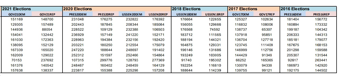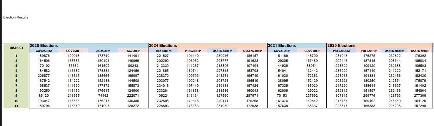 - Past election results for the new Virginia districts: 10D-1R in 2025, 2024, 2020, 2018, 2017