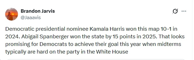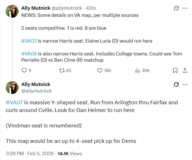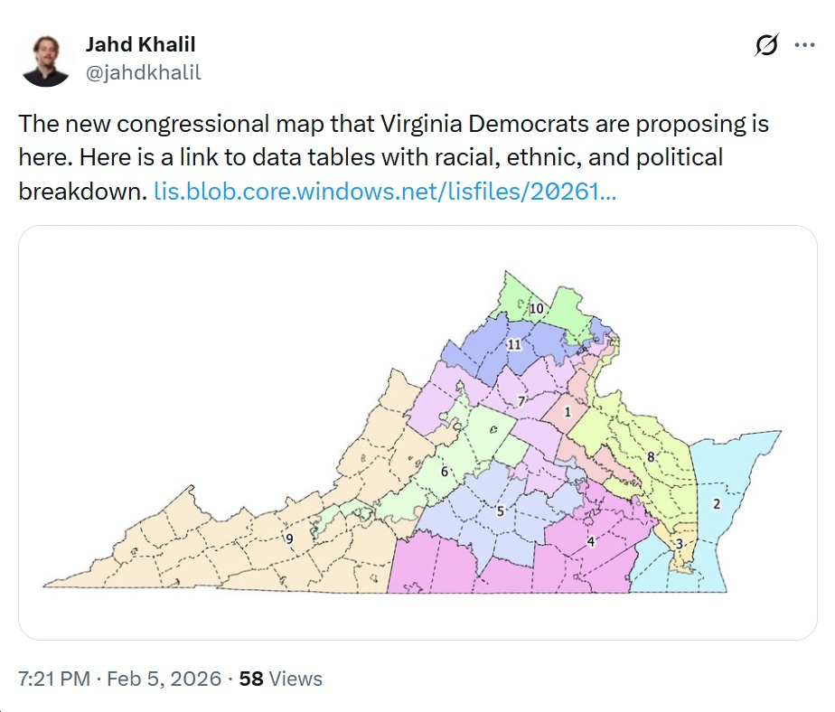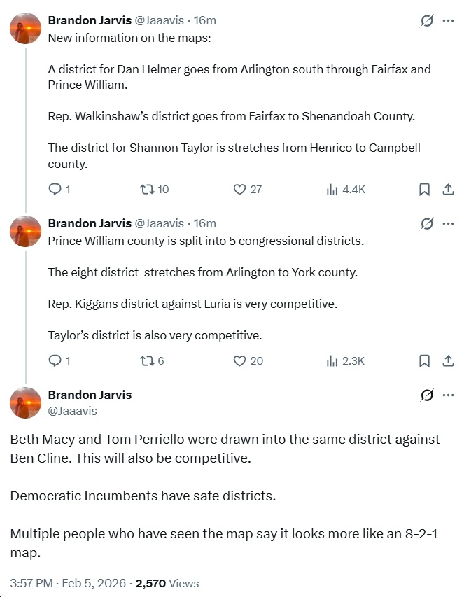 By the way, a 10D-1R map would mean that the only Republican left standing would be Rep. Morgan Griffith, who (mis)represents one of the reddest districts in America, VA09 in SW Virginia. It also would mean likely defeat for: Rep. Rob Wittman (R-VA01), Rep. Jen Kiggans (R-VA02), Rep. John McGuire (R-VA05) and Rep. Ben Cline (R-VA06). Of course, we’ll have to see the exact map to know the details of these districts, including whether or not these rumors were accurate (e.g., will there be districts drawn for Del. Dan Helmer and/or State Senator Russet Perry and/or State Senator Lamont Bagby to run in? Will Tom Perriello be put into a district with Shannon Taylor? What exactly will VA06 look like, and will it end up being Beth Macy vs. Wendy Gooditis or something else? Lots more questions…which hopefully will be answered in the next 24 hours, so stay tuned!
