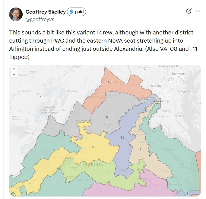UPDATE 4:56 pm: Geoffrey Skelley of DecisionDeskHQ says “This sounds a bit like this variant I drew, although with another district cutting through PWC and the eastern NoVA seat stretching up into Arlington instead of ending just outside Alexandria. (Also VA-08 and -11 flipped)”