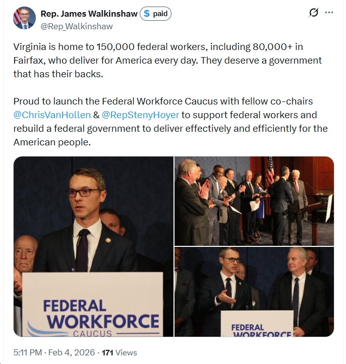 “As Co-Chair and Founder of the Federal Workforce Caucus, I’m proud to lead this effort to advocate for our dedicated federal workers and the good government values they uphold,” said Congressman Walkinshaw. “Virginia is home to nearly 150,000 federal workers, including more than 60,000 in Fairfax, who care for veterans, protect our food supply, respond to disasters, and keep essential programs running. Too often, they are treated as political targets instead of the backbone of an effective, nonpartisan civil service. This Caucus will be on the front lines defending merit-based public service and advancing policies to strengthen recruitment and retention, boost morale, and modernize pay and professional development. We will work every day to ensure government delivers world-class services for all Americans.”