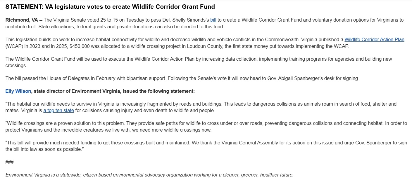 Anyway, obviously we’re not going to solve all of this country’s problems overnight, if ever. In the meantime, let’s make sure that excellent legislation like Del. Shelly Simonds’ HB597 (“Wildlife Corridor Grant Fund; created, voluntary contributions, report”) passes and is signed into law. It won’t solve the problem by any means, but at least it’s a start!