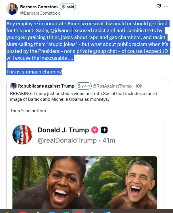 See below for a statement by VA Speaker Don Scott, and note that ZERO Virginia Republican leaders have condemned the racist video reposted by Trump – “that depicted former President Barack Obama and former First Lady Michelle Obama as apes.”